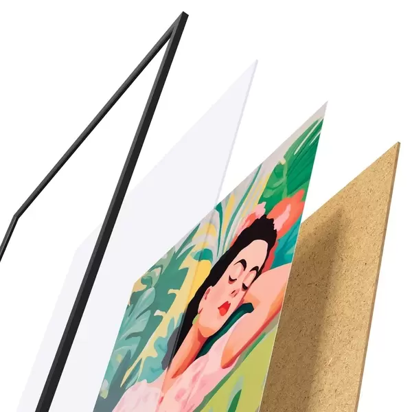 El póster consta de marco, plexiglás, imagen impresa y soporte de aglomerado. El póster puede colgarse inmediatamente en la pared gracias a los soportes de la parte posterior.