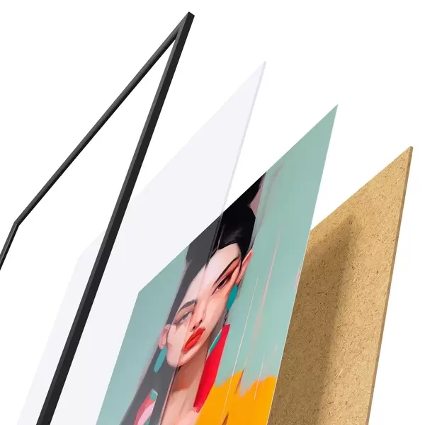 El póster consta de marco, plexiglás, imagen impresa y soporte de aglomerado. El póster puede colgarse inmediatamente en la pared gracias a los soportes de la parte posterior.