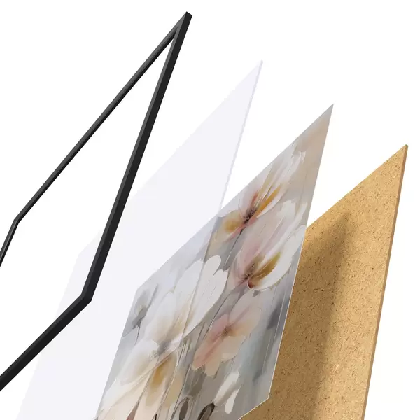 El póster consta de marco, plexiglás, imagen impresa y soporte de aglomerado. El póster puede colgarse inmediatamente en la pared gracias a los soportes de la parte posterior.