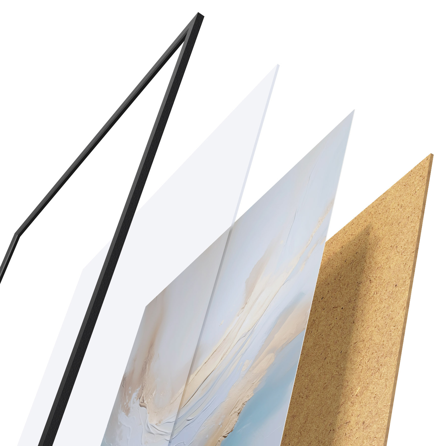 El póster consta de marco, plexiglás, imagen impresa y soporte de aglomerado. El póster puede colgarse inmediatamente en la pared gracias a los soportes de la parte posterior.