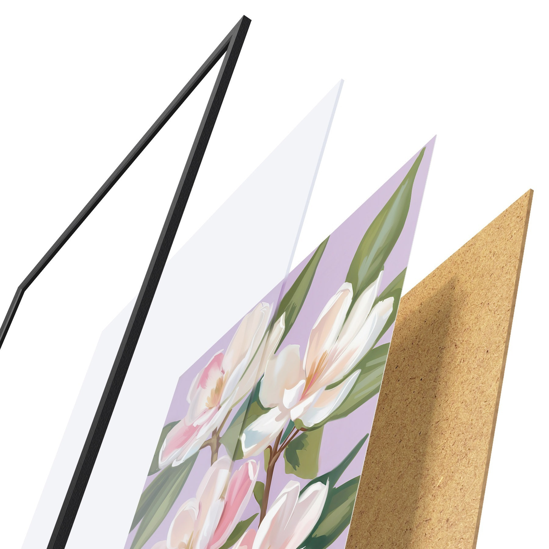 El póster consta de marco, plexiglás, imagen impresa y soporte de aglomerado. El póster puede colgarse inmediatamente en la pared gracias a los soportes de la parte posterior.