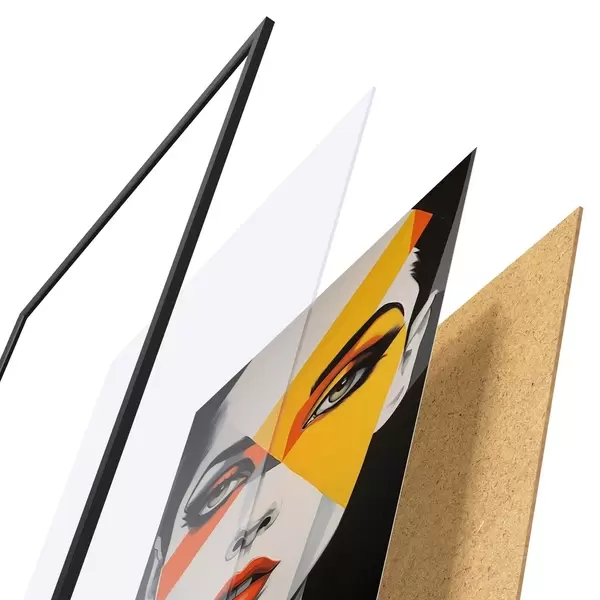 El póster consta de marco, plexiglás, imagen impresa y soporte de aglomerado. El póster puede colgarse inmediatamente en la pared gracias a los soportes de la parte posterior.