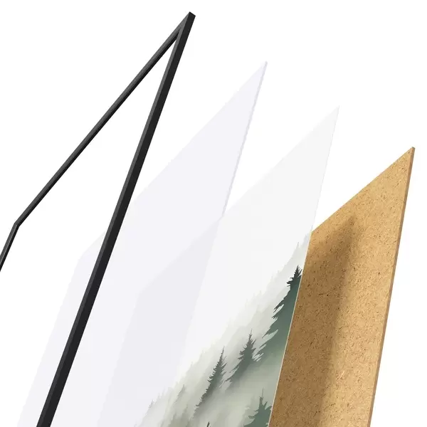 El póster consta de marco, plexiglás, imagen impresa y soporte de aglomerado. El póster puede colgarse inmediatamente en la pared gracias a los soportes de la parte posterior.