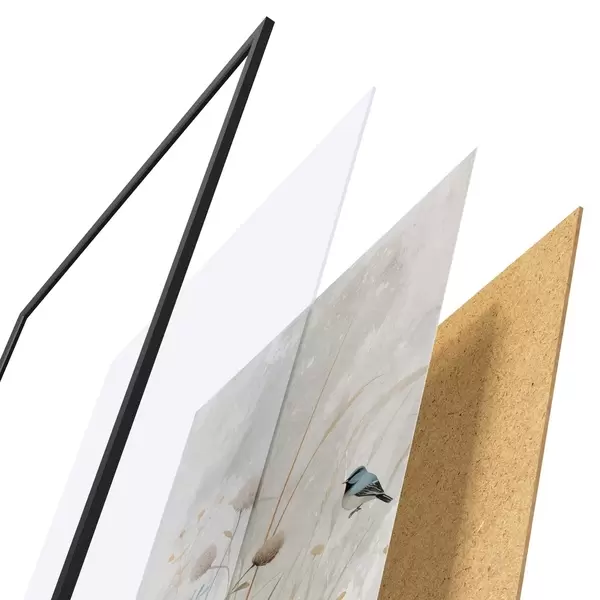 El póster consta de marco, plexiglás, imagen impresa y soporte de aglomerado. El póster puede colgarse inmediatamente en la pared gracias a los soportes de la parte posterior.