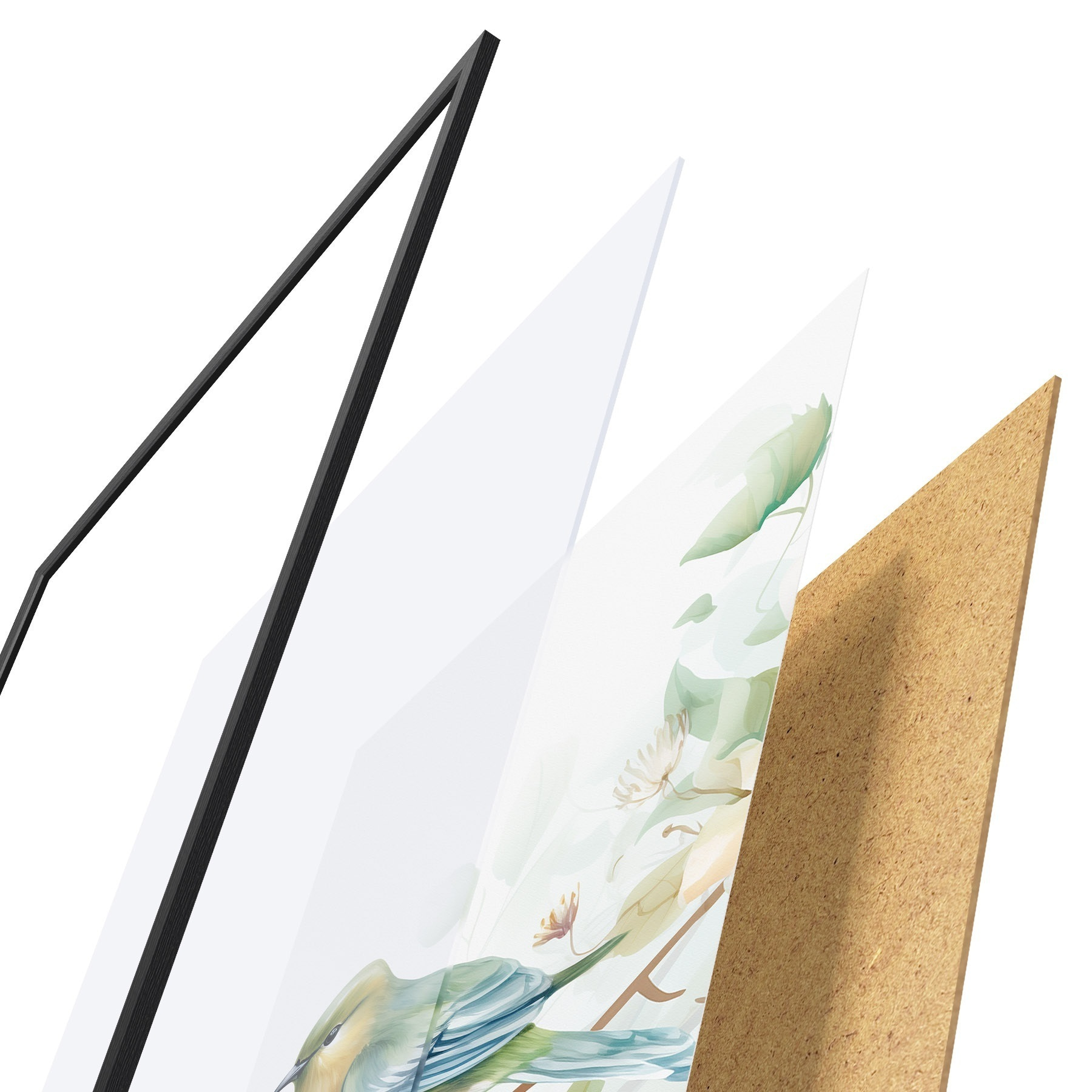 El póster consta de marco, plexiglás, imagen impresa y soporte de aglomerado. El póster puede colgarse inmediatamente en la pared gracias a los soportes de la parte posterior.
