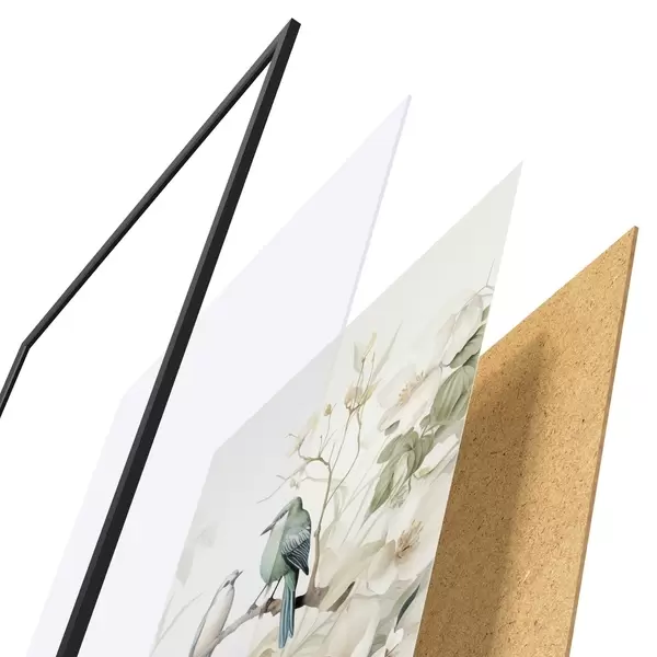 El póster consta de marco, plexiglás, imagen impresa y soporte de aglomerado. El póster puede colgarse inmediatamente en la pared gracias a los soportes de la parte posterior.
