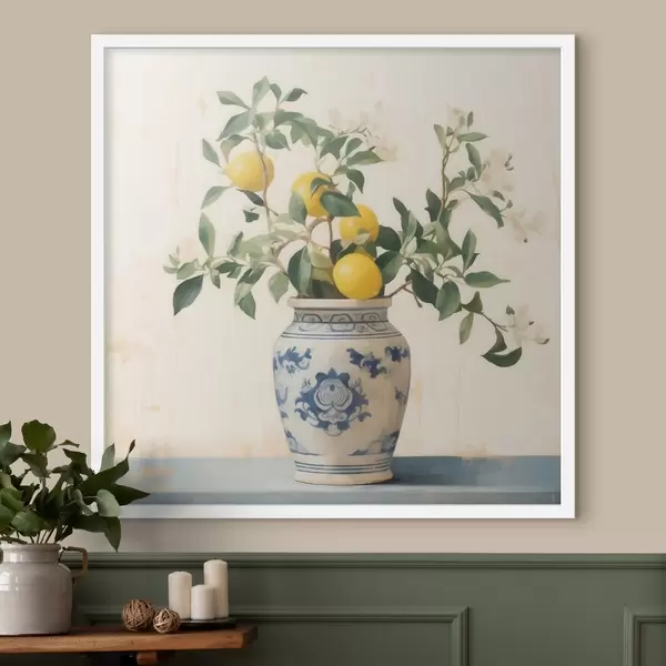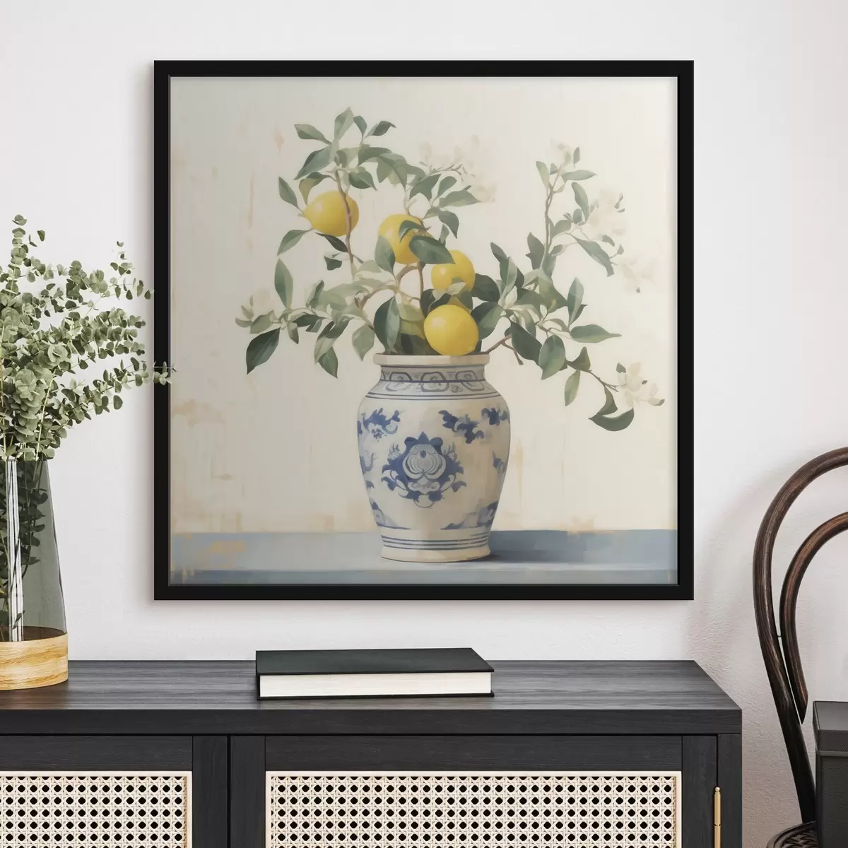 Poster Limones en un jarrón de cerámica azul y blanco al estilo de una pintura al óleo. Nr f46924