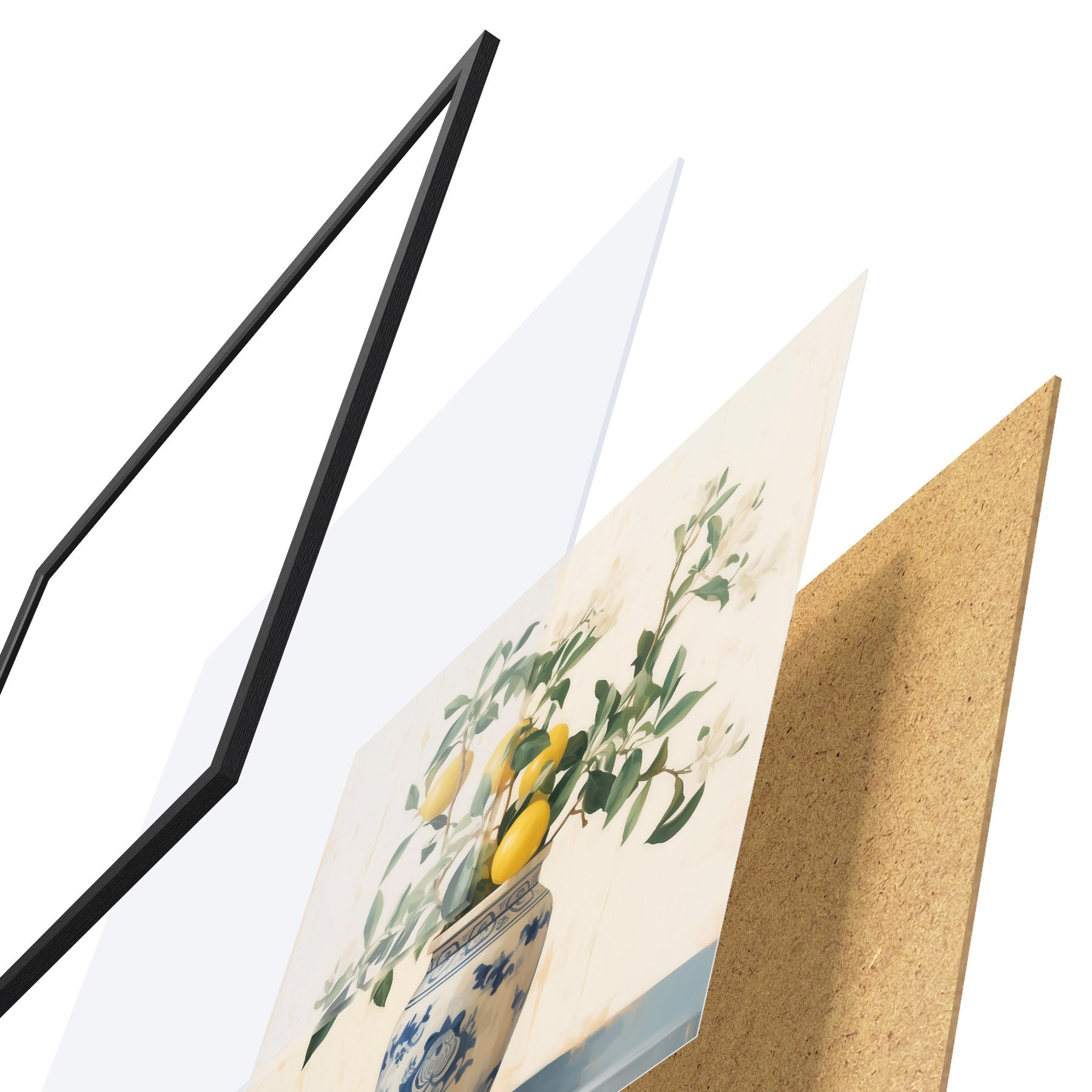 El póster consta de marco, plexiglás, imagen impresa y soporte de aglomerado. El póster puede colgarse inmediatamente en la pared gracias a los soportes de la parte posterior.