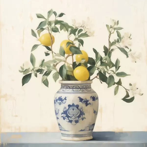 Poster Limones en un jarrón de cerámica azul y blanco al estilo de una pintura al óleo. f46924