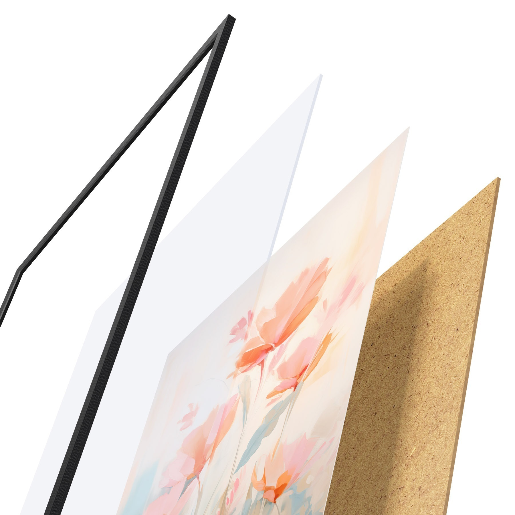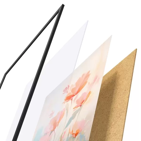 El póster consta de marco, plexiglás, imagen impresa y soporte de aglomerado. El póster puede colgarse inmediatamente en la pared gracias a los soportes de la parte posterior.