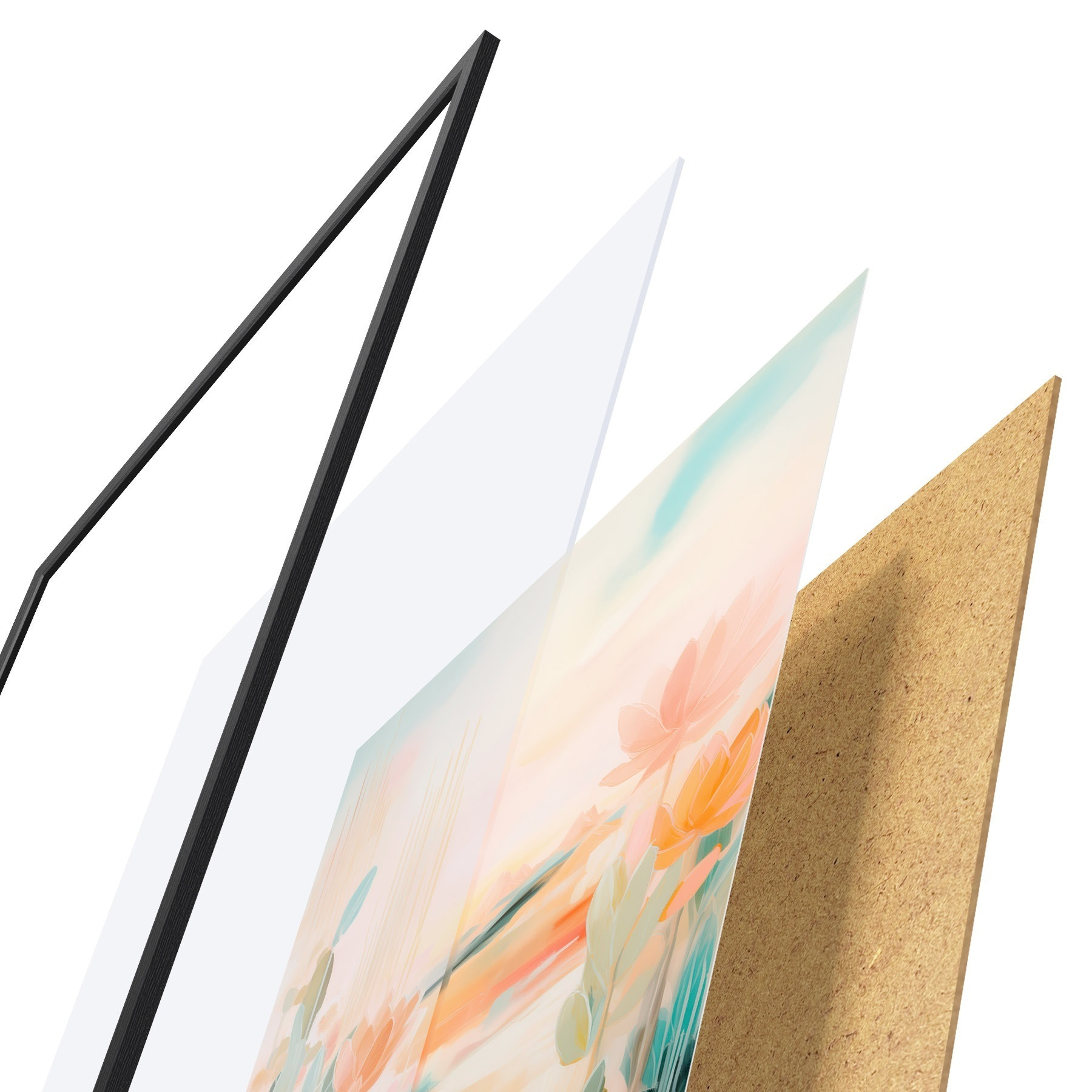 El póster consta de marco, plexiglás, imagen impresa y soporte de aglomerado. El póster puede colgarse inmediatamente en la pared gracias a los soportes de la parte posterior.
