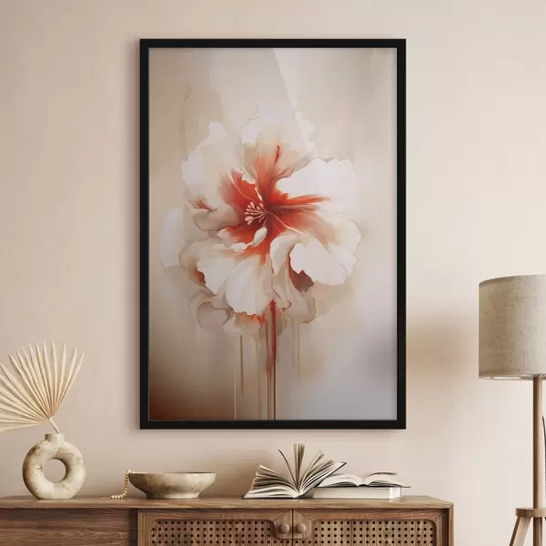 Poster Flor blanca y roja con pétalos semitransparentes y gotas de pintura fluidas. Nr f46940