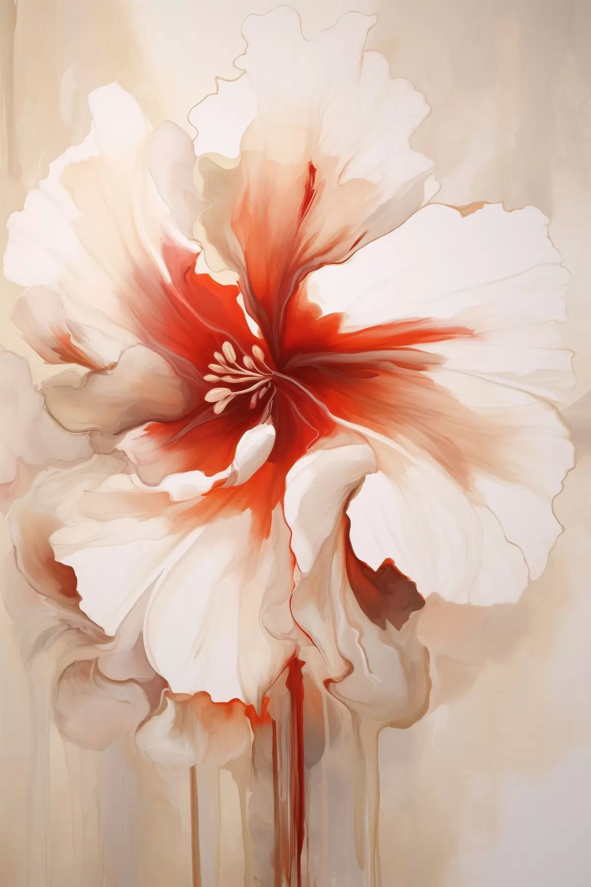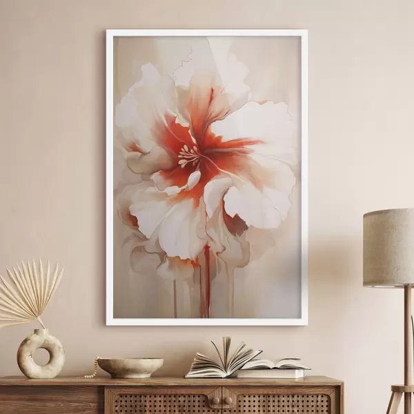 Poster Primer plano de una flor blanca y roja con pétalos semitransparentes y gotas de pintura fluidas. f46941