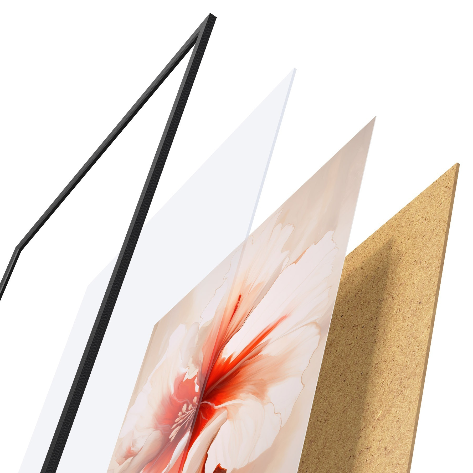 El póster consta de marco, plexiglás, imagen impresa y soporte de aglomerado. El póster puede colgarse inmediatamente en la pared gracias a los soportes de la parte posterior.