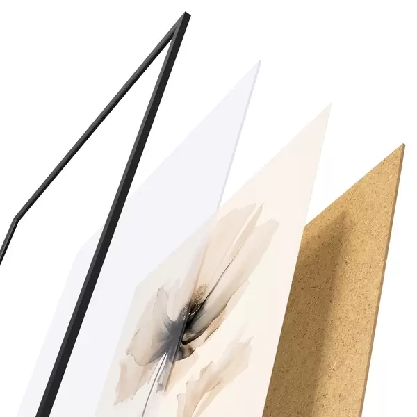 El póster consta de marco, plexiglás, imagen impresa y soporte de aglomerado. El póster puede colgarse inmediatamente en la pared gracias a los soportes de la parte posterior.