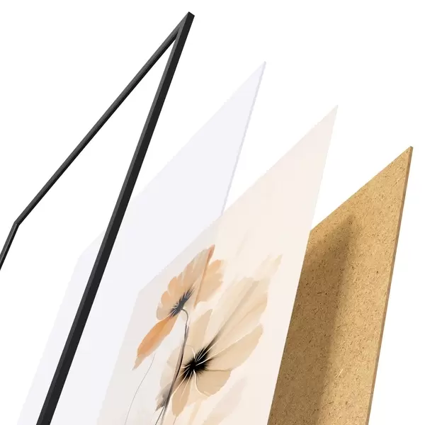 El póster consta de marco, plexiglás, imagen impresa y soporte de aglomerado. El póster puede colgarse inmediatamente en la pared gracias a los soportes de la parte posterior.
