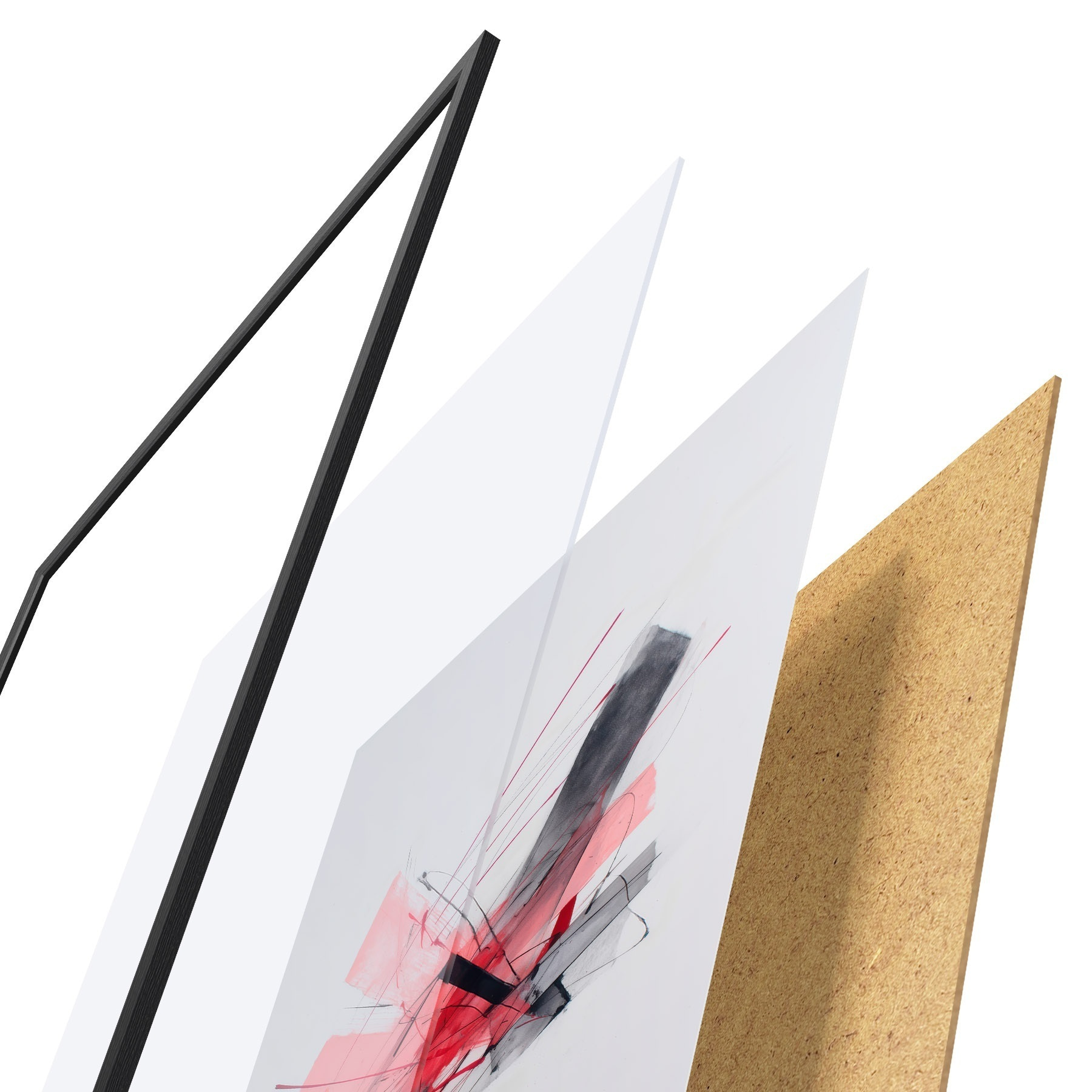 El póster consta de marco, plexiglás, imagen impresa y soporte de aglomerado. El póster puede colgarse inmediatamente en la pared gracias a los soportes de la parte posterior.