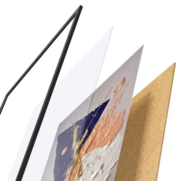 El póster consta de marco, plexiglás, imagen impresa y soporte de aglomerado. El póster puede colgarse inmediatamente en la pared gracias a los soportes de la parte posterior.