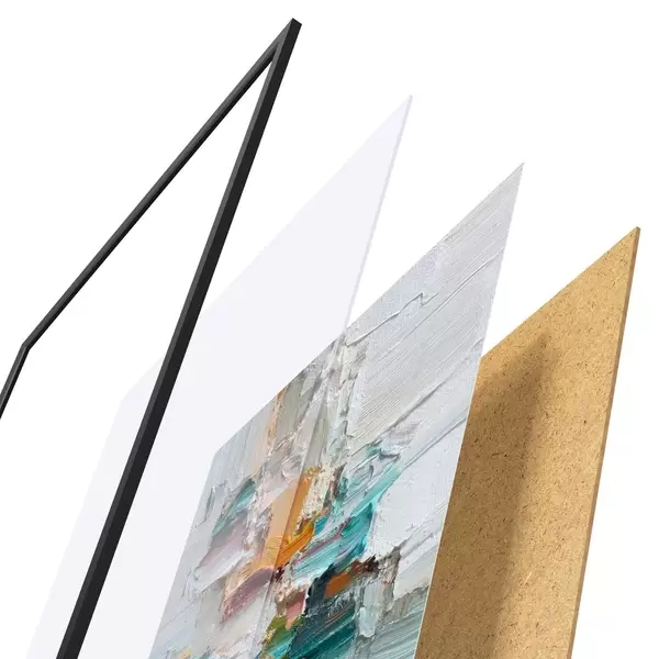 El póster consta de marco, plexiglás, imagen impresa y soporte de aglomerado. El póster puede colgarse inmediatamente en la pared gracias a los soportes de la parte posterior.