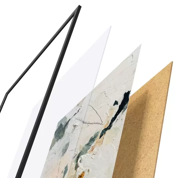 El póster consta de marco, plexiglás, imagen impresa y soporte de aglomerado. El póster puede colgarse inmediatamente en la pared gracias a los soportes de la parte posterior.