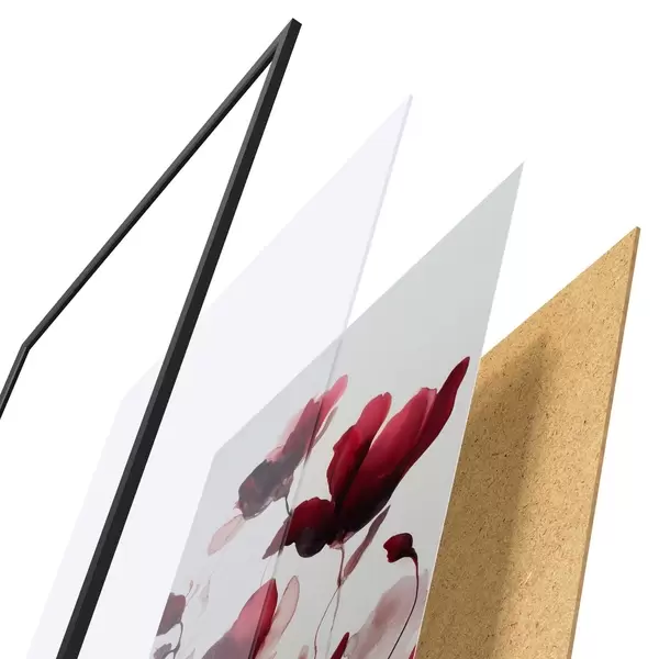 El póster consta de marco, plexiglás, imagen impresa y soporte de aglomerado. El póster puede colgarse inmediatamente en la pared gracias a los soportes de la parte posterior.