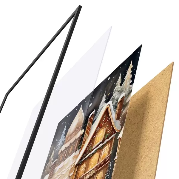 El póster consta de marco, plexiglás, imagen impresa y soporte de aglomerado. El póster puede colgarse inmediatamente en la pared gracias a los soportes de la parte posterior.