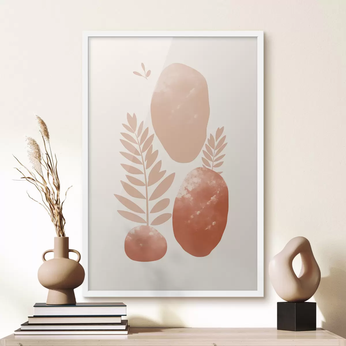 Poster Formas abstractas, piedras y hojas con textura en tonos melocotón y terracota apagados, minimalistas, fondo crema. Nr f47012