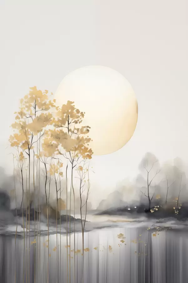 Poster Paisaje abstracto decorativo, árboles altos con hojas amarillas, un río y niebla al fondo Nr f47014