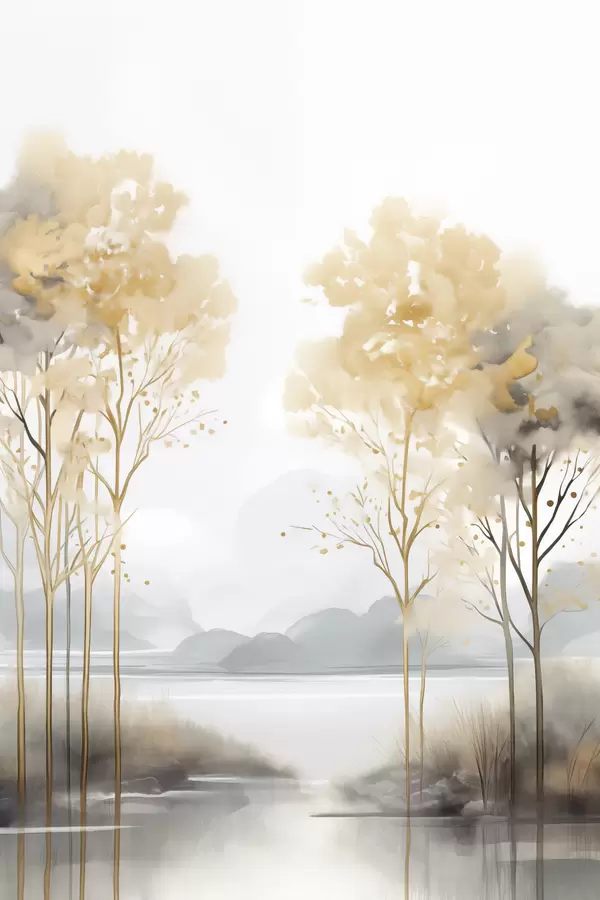 Poster Paisaje abstracto decorativo, árboles altos con hojas amarillas, un río y niebla al fondo f47015