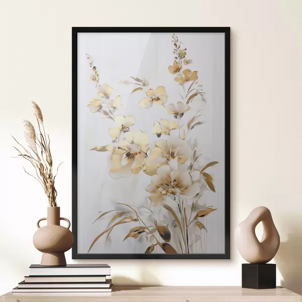 Poster Flores y hojas amarillas con textura sobre fondo blanco, con delicadas pinceladas. Nr f47016