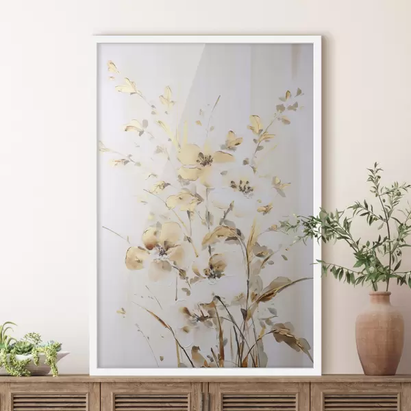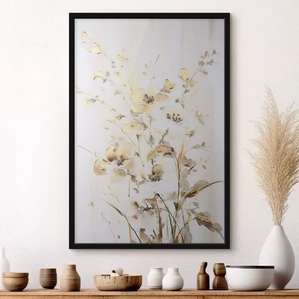 Poster Flores y hojas amarillas con textura sobre fondo blanco, con delicadas pinceladas. Nr f47017