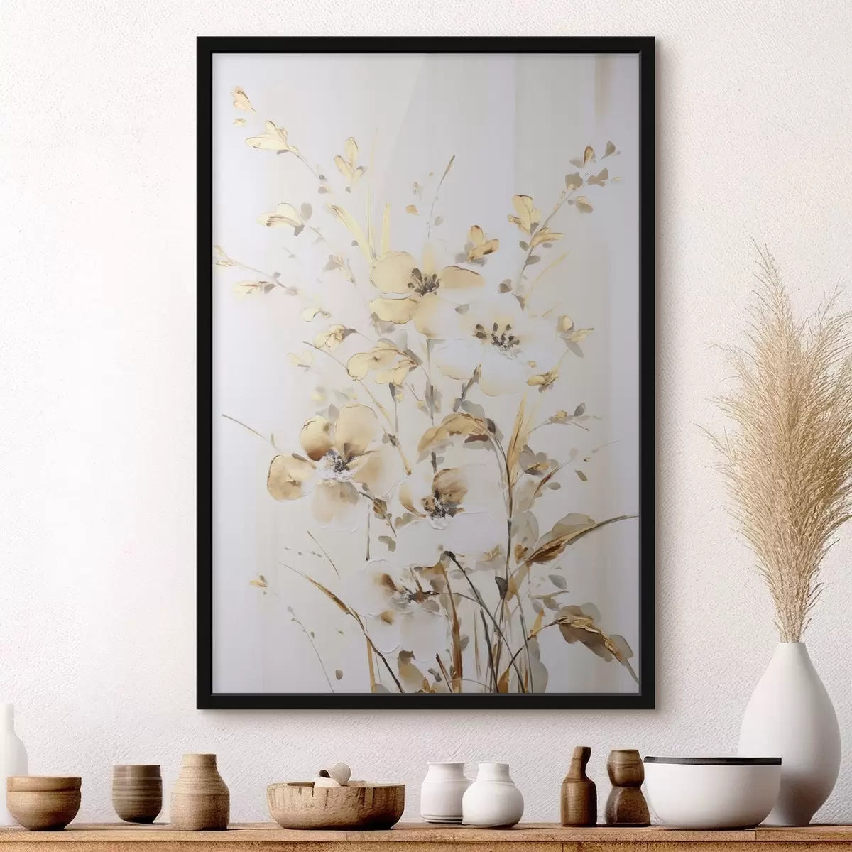 Poster Flores y hojas amarillas con textura sobre fondo blanco, con delicadas pinceladas. f47017