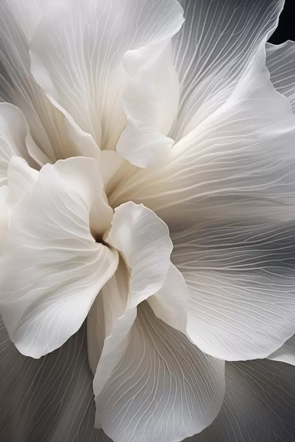 Poster Primer plano de delicados pétalos florales blancos abstractos con líneas intrincadas y un fondo oscuro difuminado Nr f47018
