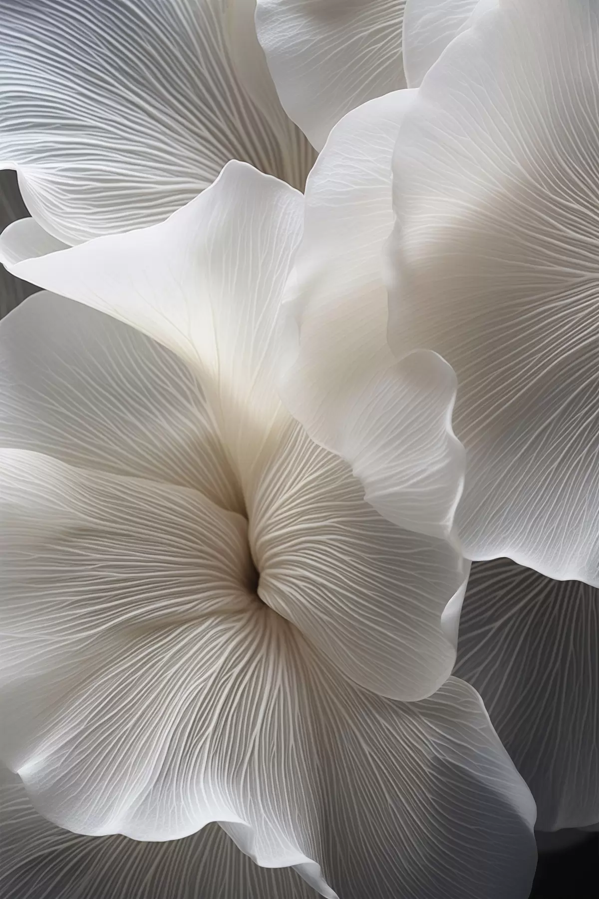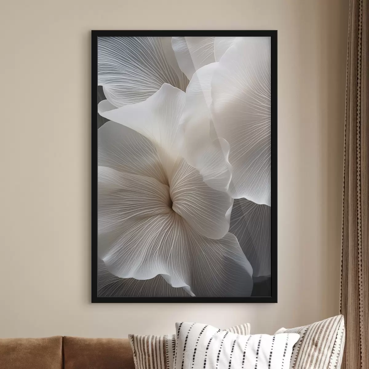 Poster Primer plano de delicados pétalos florales blancos abstractos con líneas intrincadas y un fondo oscuro difuminado. f47019