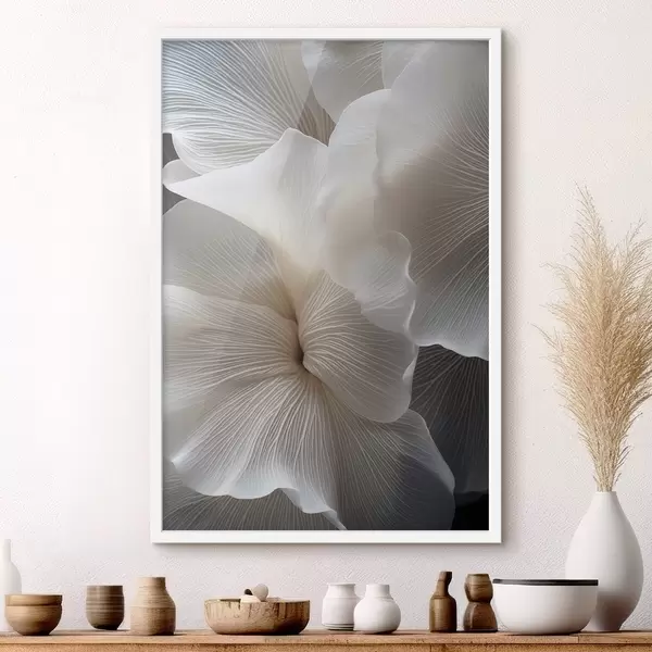Poster Primer plano de delicados pétalos florales blancos abstractos con líneas intrincadas y un fondo oscuro difuminado. Nr f47019