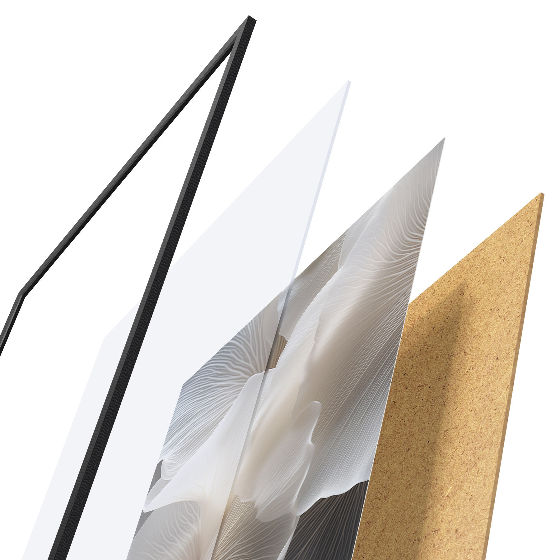 El póster consta de marco, plexiglás, imagen impresa y soporte de aglomerado. El póster puede colgarse inmediatamente en la pared gracias a los soportes de la parte posterior.