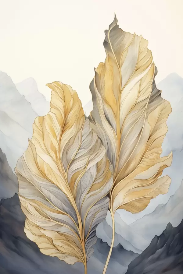 Poster Hojas abstractas grandes, amarillas y marrones con detalles intrincados, sobre un paisaje montañoso Nr f47023