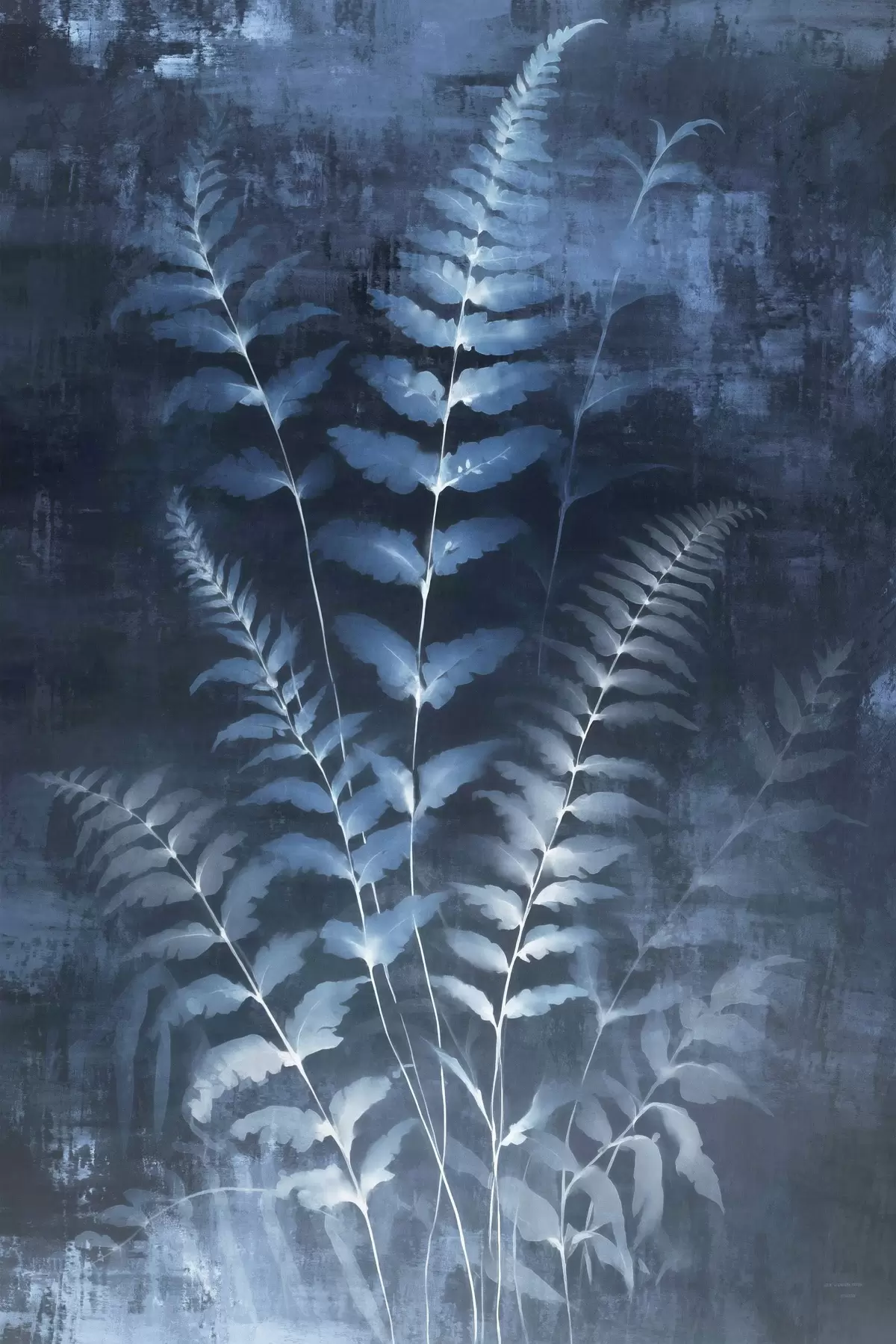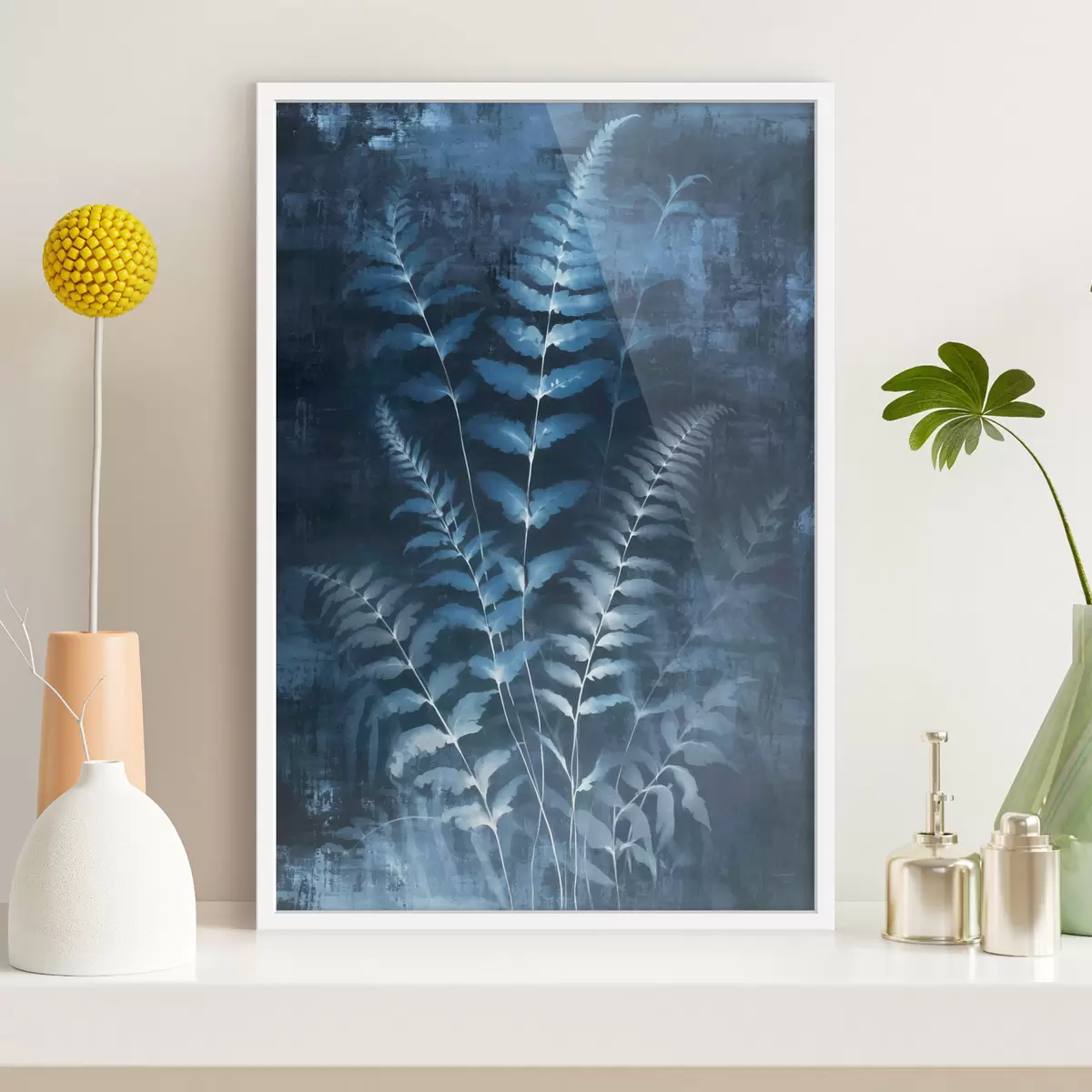 Poster Helechos y plantas azules sobre un fondo oscuro y texturizado, con énfasis en los detalles intrincados, efecto radiográfico. Nr f47027