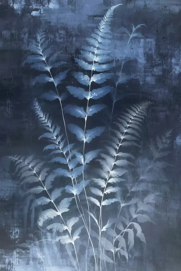 Poster Helechos y plantas azules sobre un fondo oscuro y texturizado, con énfasis en los detalles intrincados, efecto radiográfico Nr f47027