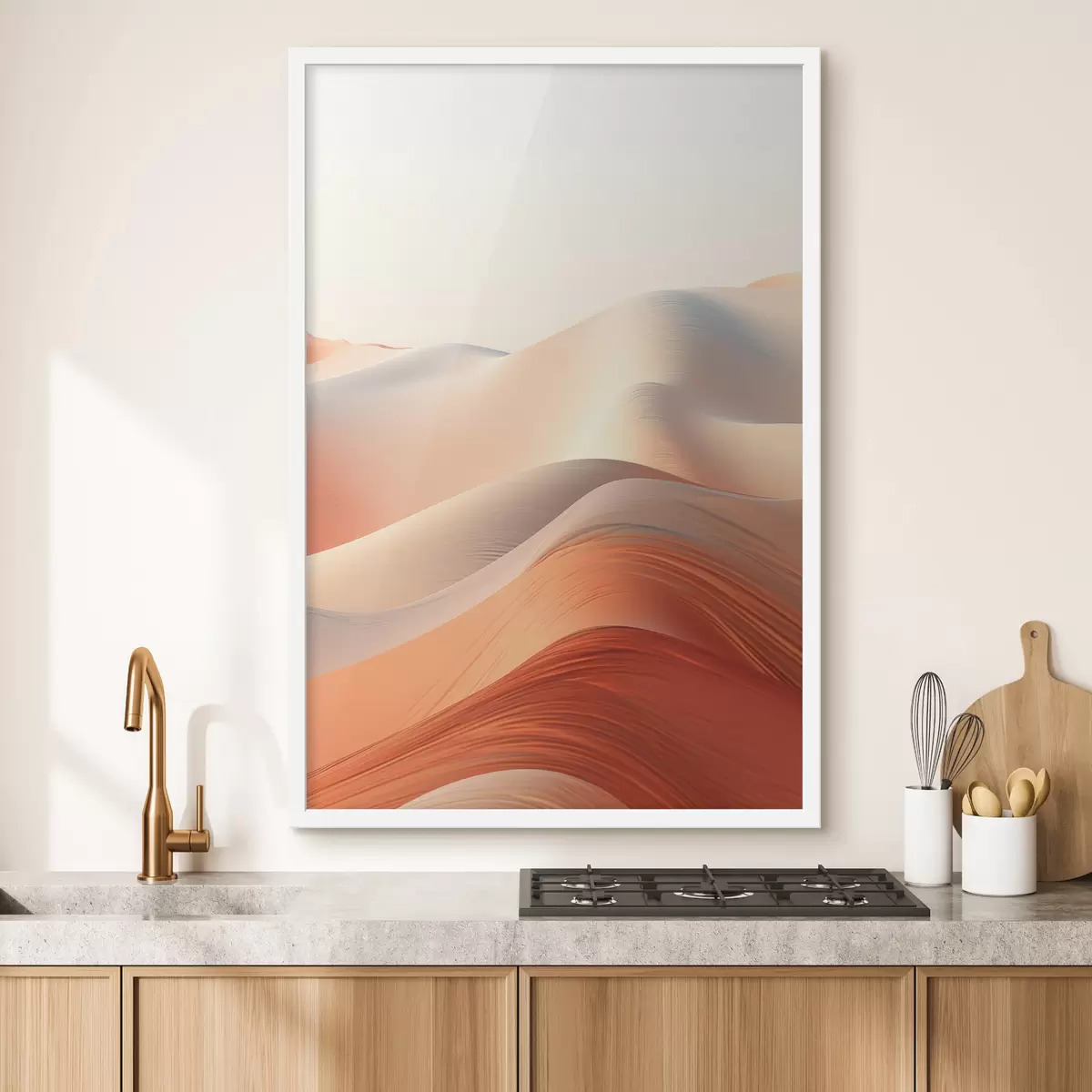 Poster Paisaje desértico abstracto con dunas de arena ondulantes en tonos cálidos naranjas y blancos. Nr f47031