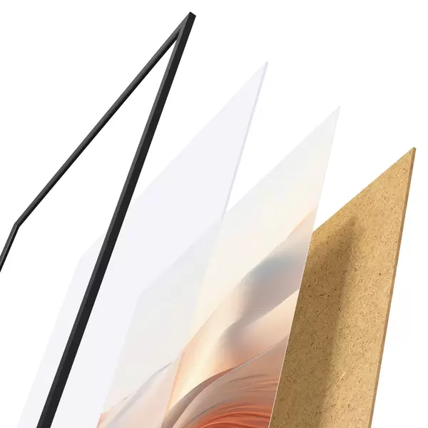 El póster consta de marco, plexiglás, imagen impresa y soporte de aglomerado. El póster puede colgarse inmediatamente en la pared gracias a los soportes de la parte posterior.