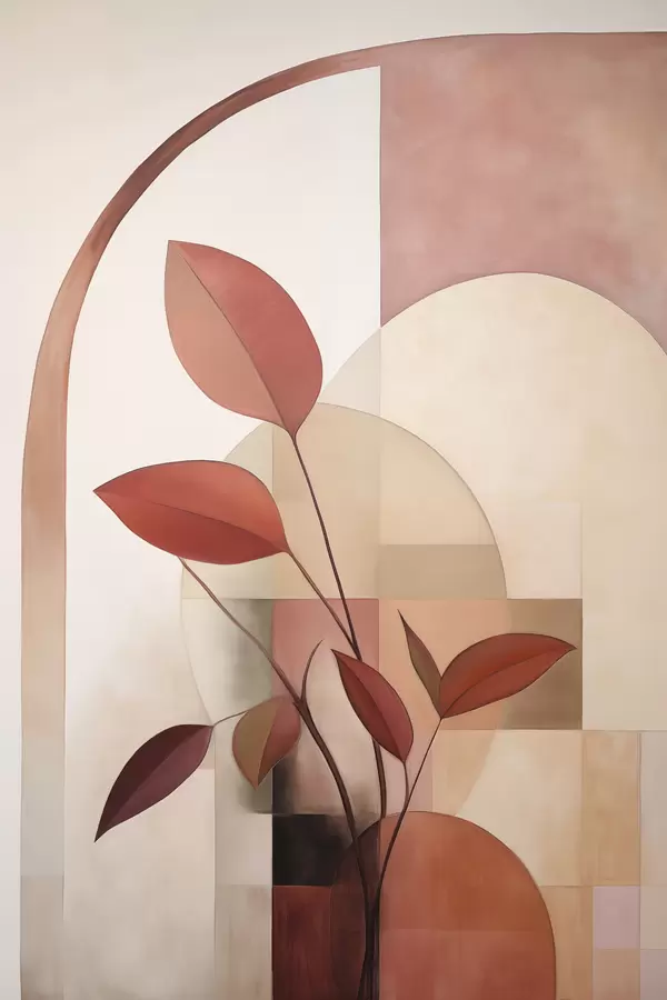 Poster Planta abstracta con hojas rojas sobre un fondo de formas geométricas y colores suaves y apagados Nr f47040