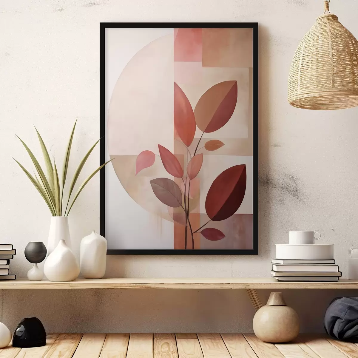 Poster Planta abstracta con hojas rojas sobre un fondo de formas geométricas y colores suaves y apagados. f47041