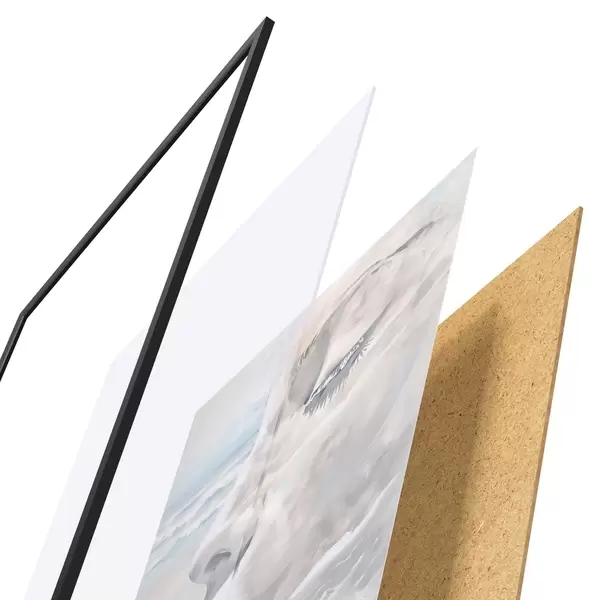 El póster consta de marco, plexiglás, imagen impresa y soporte de aglomerado. El póster puede colgarse inmediatamente en la pared gracias a los soportes de la parte posterior.