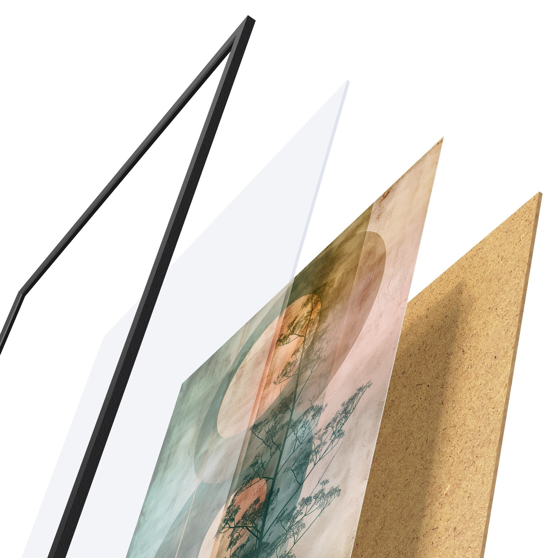 El póster consta de marco, plexiglás, imagen impresa y soporte de aglomerado. El póster puede colgarse inmediatamente en la pared gracias a los soportes de la parte posterior.