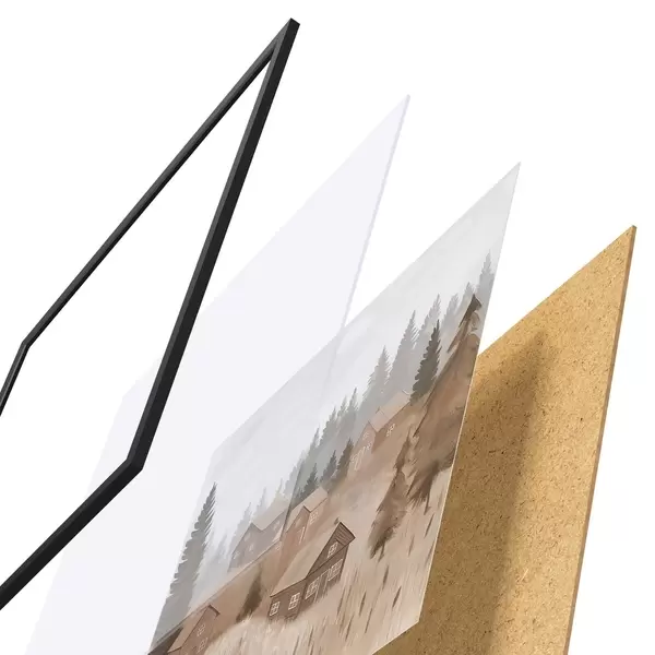 El póster consta de marco, plexiglás, imagen impresa y soporte de aglomerado. El póster puede colgarse inmediatamente en la pared gracias a los soportes de la parte posterior.