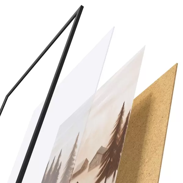 El póster consta de marco, plexiglás, imagen impresa y soporte de aglomerado. El póster puede colgarse inmediatamente en la pared gracias a los soportes de la parte posterior.