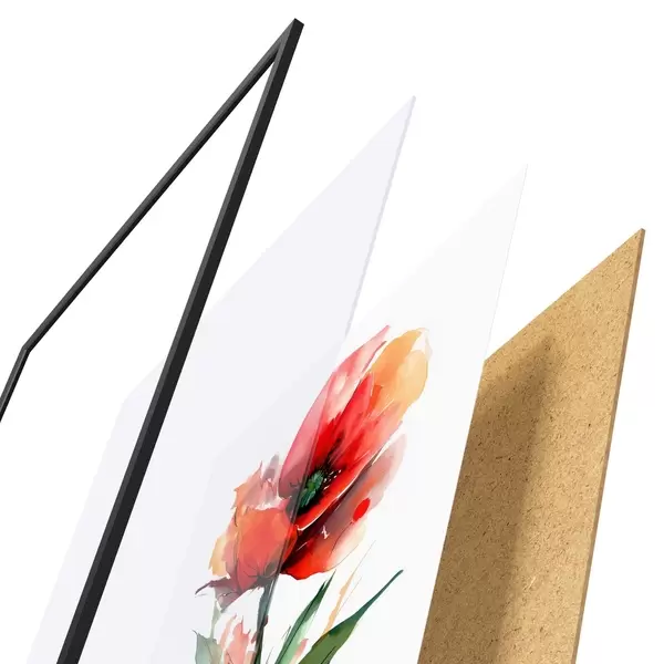 El póster consta de marco, plexiglás, imagen impresa y soporte de aglomerado. El póster puede colgarse inmediatamente en la pared gracias a los soportes de la parte posterior.