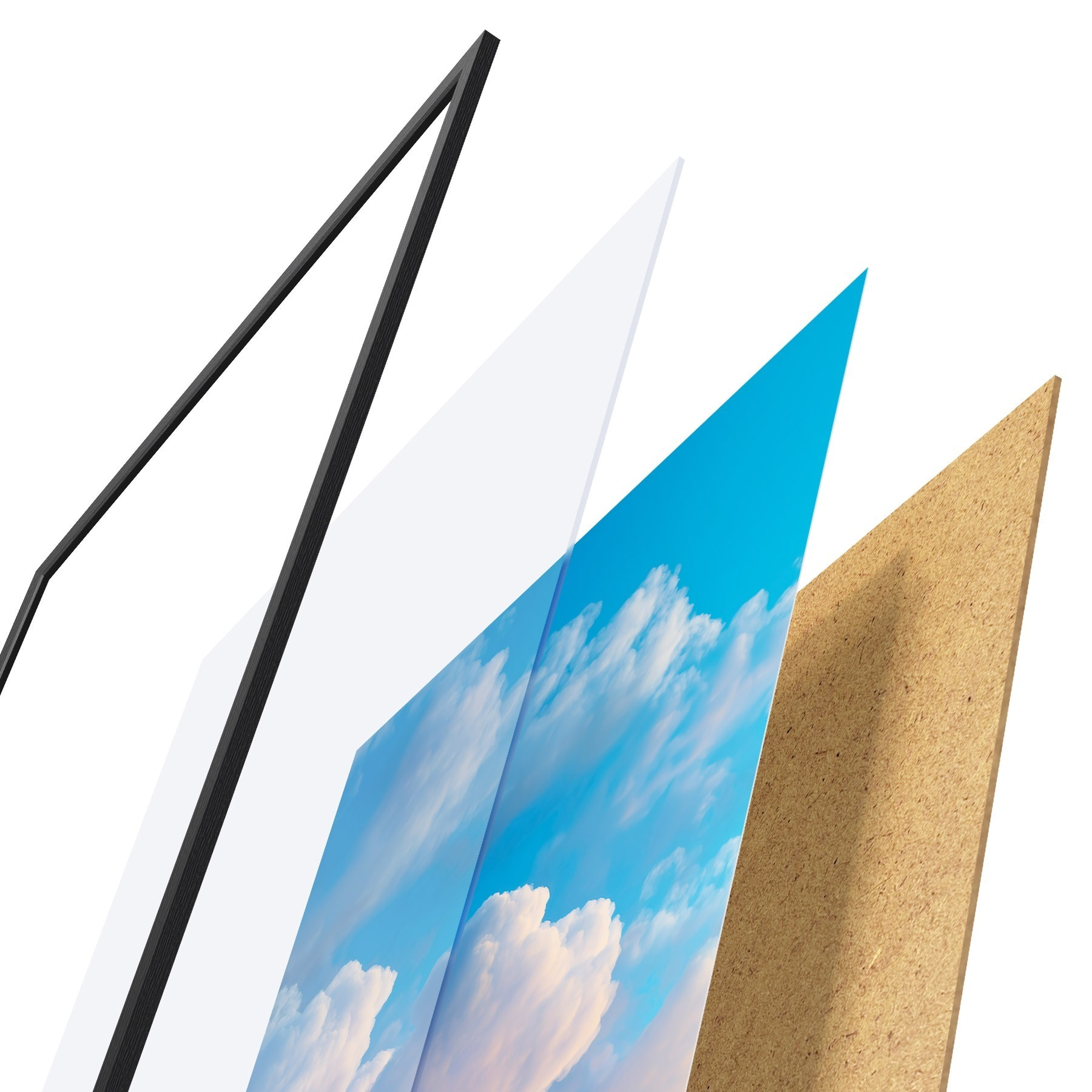 El póster consta de marco, plexiglás, imagen impresa y soporte de aglomerado. El póster puede colgarse inmediatamente en la pared gracias a los soportes de la parte posterior.