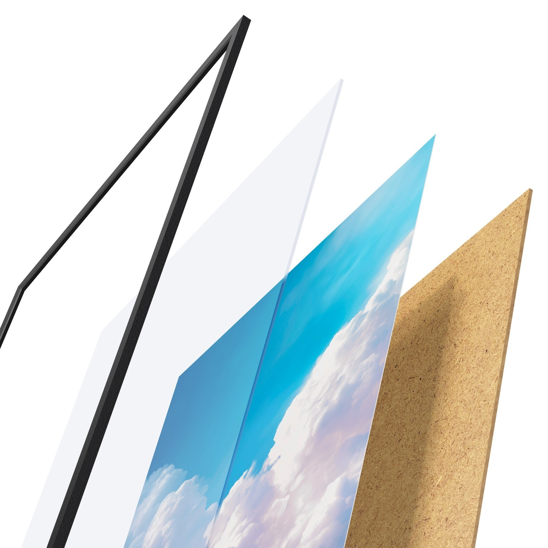 El póster consta de marco, plexiglás, imagen impresa y soporte de aglomerado. El póster puede colgarse inmediatamente en la pared gracias a los soportes de la parte posterior.